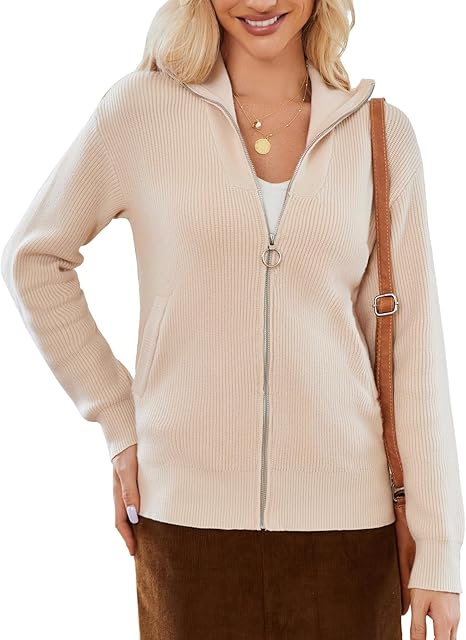 Women's Zip Up Cardigan Sweater Lapel Ribbed Knit Long Sleeve Sweater Jacket with Pockets Warm Outwear