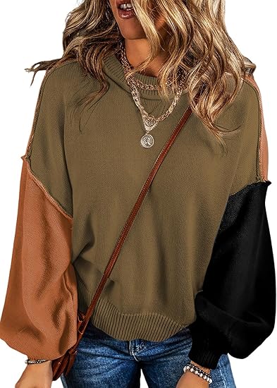 Womens Color Block Sweaters Long Sleeve Crewneck Pullover Knit Jumper Tops