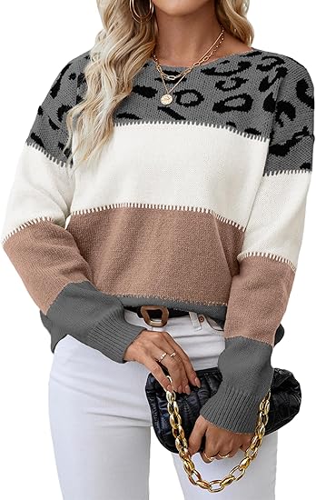 Women's Oversized Cute Color Block Leopard Sweaters Fall Causal Cozy Ribbed Knit Crewneck Pullover Sweater