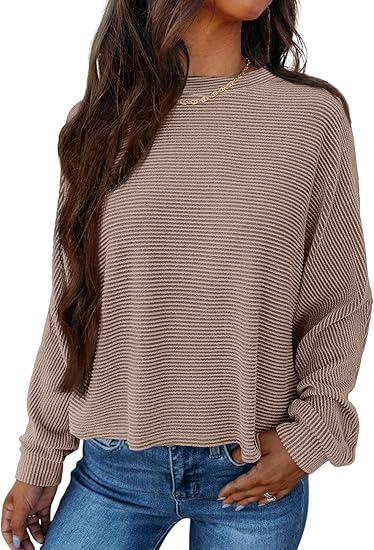 Womens Ribbed Knit Long Lantern Sleeves Sweater Crewneck Casual Slim Fit Pullover Jumper Tops